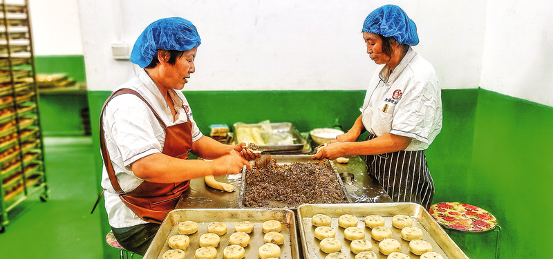9月19日,工人在镇安县维良食品加工有限公司车间制作传统月饼。该公司位于镇安县高峰镇,每天可生产月饼1000多公斤,销往镇安县城、西安等地。 (本报记者 杨 鑫 摄)