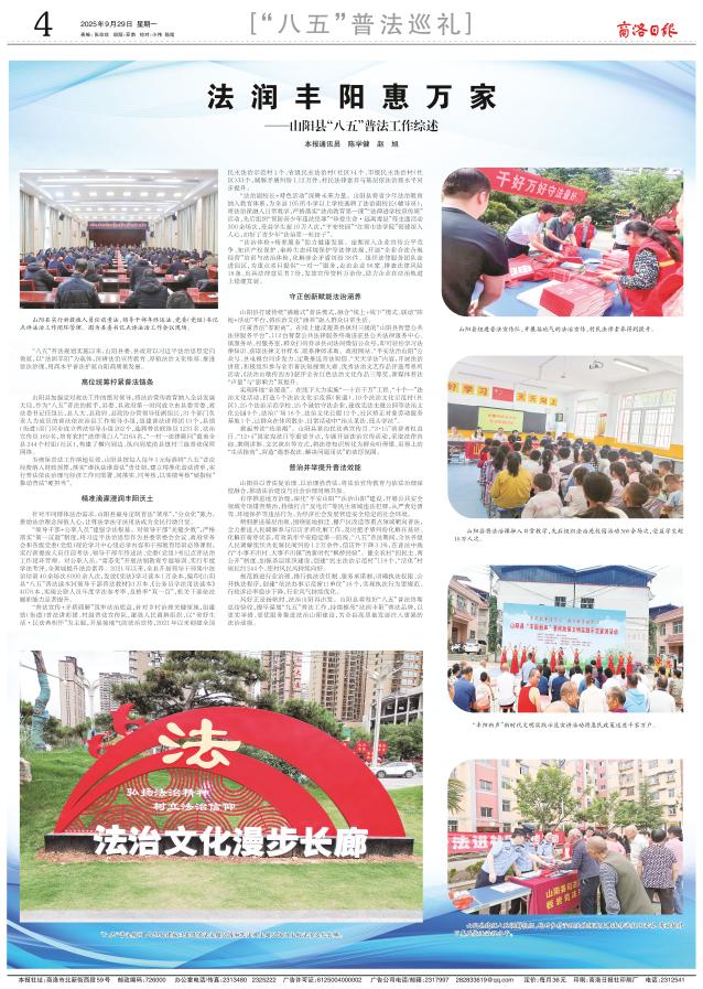 风好正是扬帆时,法治山阳再出发。山阳县将做好“八五”普法终期总结验收,提早谋划“九五”普法工作,持续擦亮“法润丰阳”普法品牌,以更实举措、更优服务推进法治山阳建设,为全县高质量发展注入更强的法治动能。