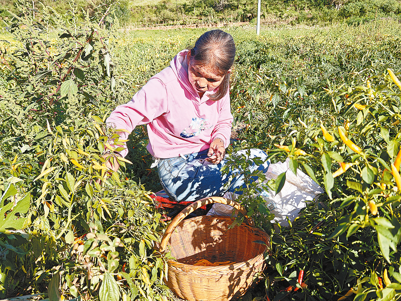 9月24日,商州区腰市镇庙前村村民在采摘朝天椒。据了解,庙前村共种植朝天椒50亩,采摘季节每天可为周边劳动力提供20个就业岗位,每天每人可增收60元左右。 (本报记者 王孝竹 摄)
