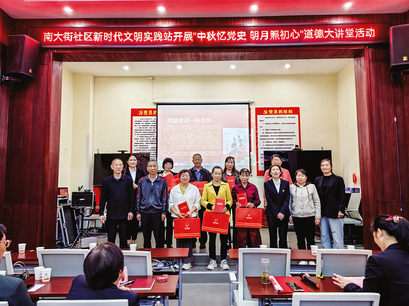 ◁9月28日,商南县城关街道南大街社区新时代文明实践站开展了“中秋忆党史 明月照初心”道德讲堂活动,对评选出的“好婆婆”“好妻子”“好儿媳”“好市民”等10名道德模范进行了表彰奖励,通过身边人讲述身边事,感受道德模范平凡的坚守和向善的品质,践行社会主义核心价值观,传递社会正能量。 (本报通讯员 代绪刚 摄)