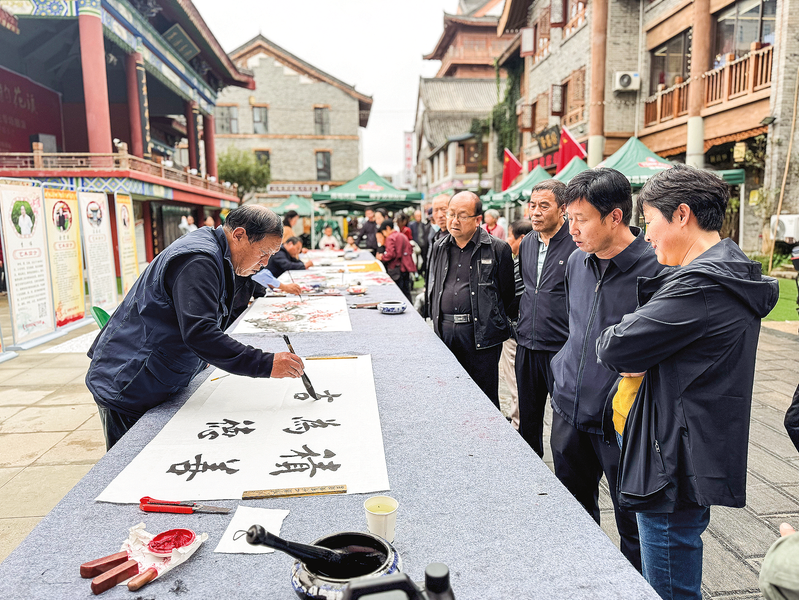 △国庆节期间,洛南县在花溪弄景区举办书画笔会活动。图为10月7日,多位书画家挥毫泼墨,为游客创作并展示书画作品。 (本报记者 方 方 摄)