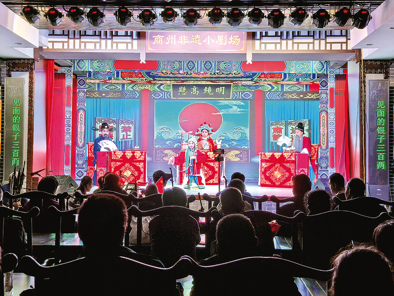△10月1日,商州区文旅局、区文工团在城区非遗小剧场举办“迎双节文化惠民演出”活动。现场,戏曲演员们为市民倾情演绎了秦腔传统剧目《玉堂春》,凭借精湛的演技与独特的唱腔,引来观众阵阵喝彩。(本报记者 方 方 摄)
