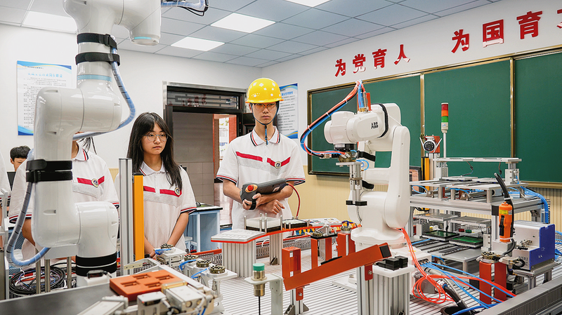 镇安县职教中心学生正在学习机械自动化生产操作。