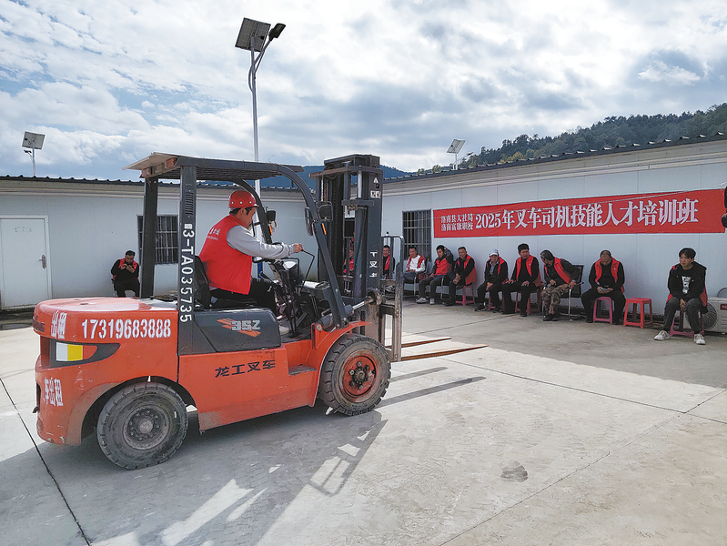 为全面打赢稳就业促增收硬仗,洛南县以“技能照亮前程”为主题,聚焦农村劳动力、脱贫群众等重点群体就业需求,积极开展职业技能提升培训,助力更多群众掌握一技之长,实现就业创业。图为10月15日,洛南县人社局联合洛南富康职业技能培训学校,在石门镇易地搬迁社区为30多名群众开展叉车司机培训。(本报通讯员 王建荣 摄)