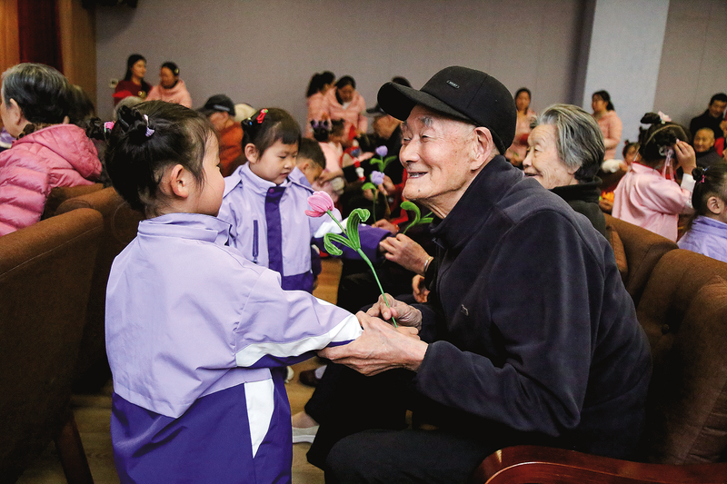 为传承中华优秀传统文化,培养学生敬老爱老的传统美德,近日,丹凤县幼儿园组织师生走进金山康养中心,为老人们送上亲手制作的手工艺品,并进行互动游戏,表达对老人们的关爱和祝福。 (本报通讯员 赵 洁 摄)