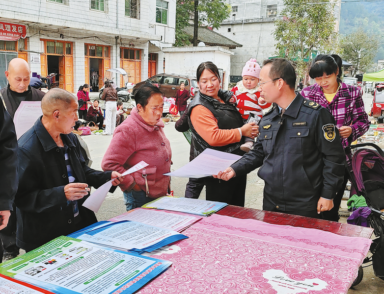 近日,市农业综合执法支队组织工作人员到山阳、洛南等县区开展秋季农资经营指导工作,向群众普及涉农法律法规和种子、农药等重点农资选购知识。图为工作人员在山阳县色河铺镇发放宣传资料。 (本报通讯员 白净 摄)
