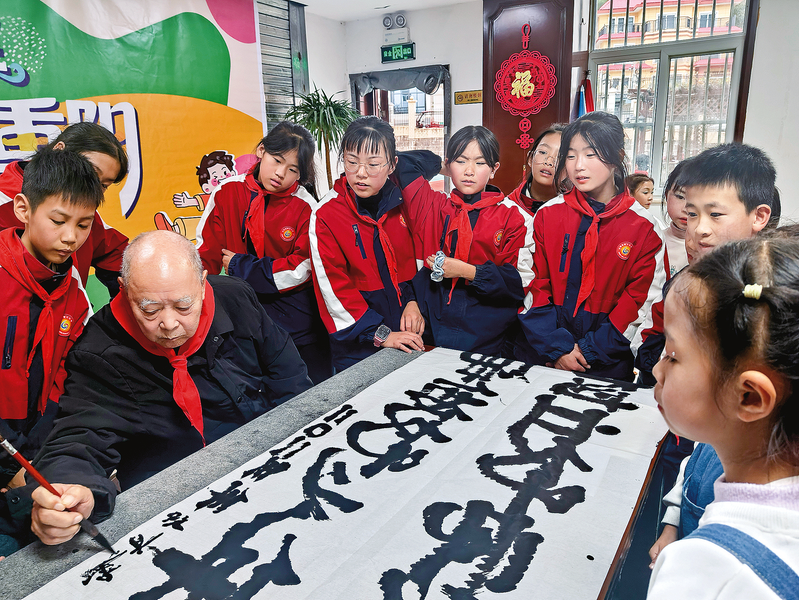 10月29日,山阳县第六小学部分师生与家长,携手城关街道高家沟社区党员干部,共100多人走进山阳县老年公寓,开展“孝老爱亲传家风,争做时代好少年”主题活动。图为85岁的李有寿老人现场创作书法作品。 (本报记者 贾书章 摄)