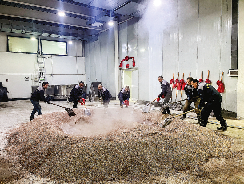 10月27日,紫元春酒庄2025年投粮大典在商州区杨斜镇秦华村举行。活动现场演示泡粮、蒸粮、摊晾、拌曲等前置工序,展示了粮食到美酒的蜕变,传统酿造的深厚底蕴。图为工人正在进行拌曲。 (本报记者 南 玺 摄)