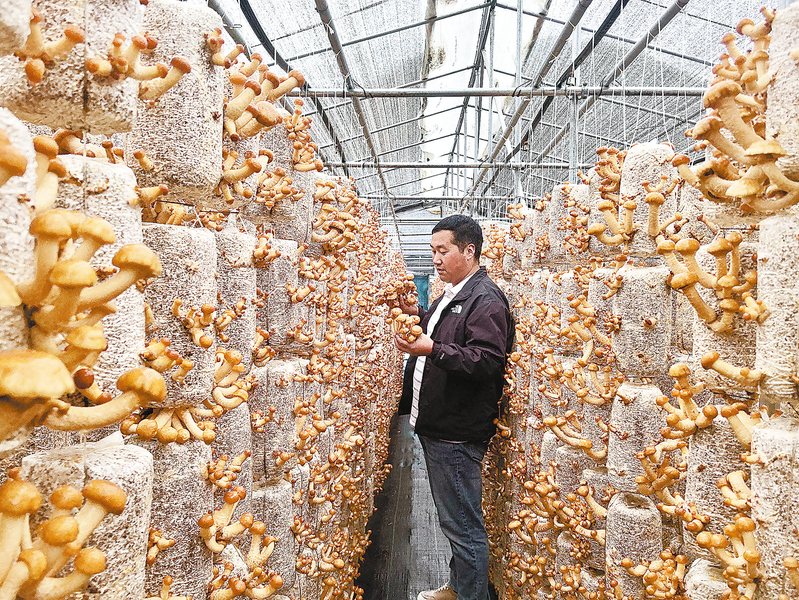 近日,柞水县凤凰镇桃园村食用菌基地的滑子菇陆续进入采摘期。据了解,为破解原有木耳大棚季节性闲置难题,桃园村今年精准调整种植结构,启用33座木耳大棚,种植35万棒滑子菇,这一举措不仅提升了大棚设施的利用率,也增加了群众增收途径。图为桃园村副主任李明召在查看滑子菇长势。