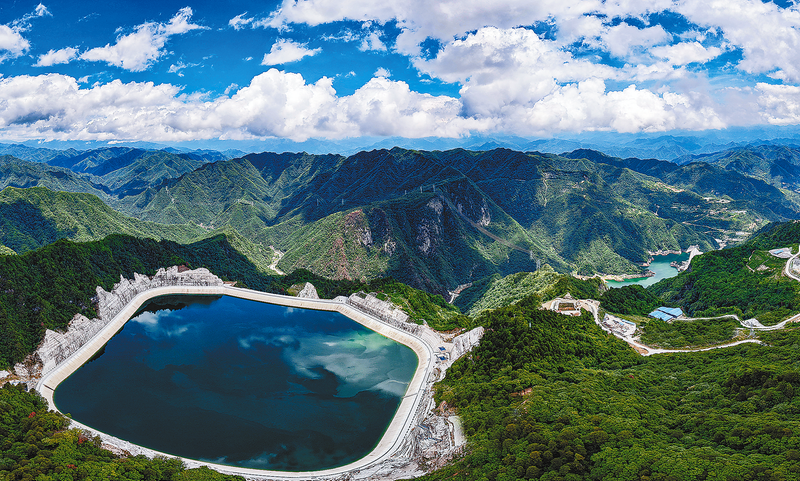 近日,在国网新源陕西镇安抽水蓄能电站,通过无人机从高空俯瞰,蓝天白云倒映下的上水库,在葱郁的青山间十分壮观,一幅“高峡出平湖、绿水绕青山”的画卷徐徐展开。