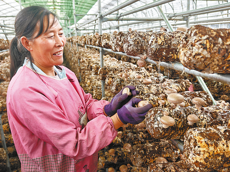 近年来,我市大力发展香菇产业,小小香菇撑起了群众“致富伞”。图为8月21日,在洛南县四皓街道的香菇种植基地,群众在采摘香菇,脸上洋溢着丰收的喜悦。 (本报记者 杨 鑫 摄)