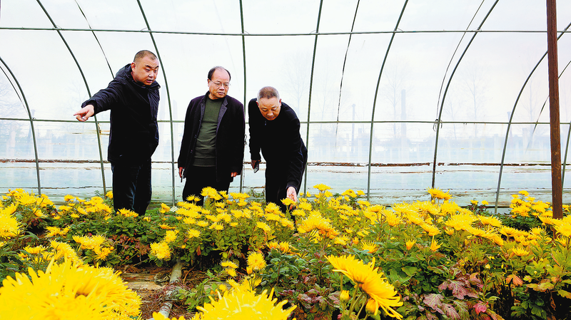 11月12日,在洛南县景村镇御史村产业园的大棚内,驻村工作队正在查看金丝皇菊的长势。据悉,该村积极发展富民产业,目前已带动300多名群众就业,实现户均增收约3500元,村集体经济收入突破20万元。目前,该村已建成金银花茶、金丝皇菊等多条产业生产线。 (本报记者 巩琳璐 摄)