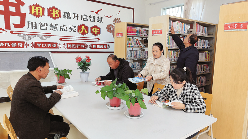 11月13日,在洛南县麻坪镇麻坪街社区的图书借阅区内,几名群众正安静地挑选、阅读书籍。该社区精心打造了舒适的休息区与借阅区,配备图书5700余册,涵盖农业科普、政史、文学等类别,面向周边群众免费开放。(本报记者 南 玺 摄)