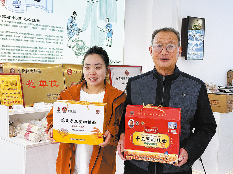 李长满与女儿李惠利展示各类手工挂面礼盒。