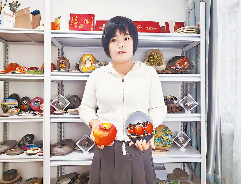 毕业后,张媛收获了爱情,结婚、怀孕,2019年,她回到丹凤老家待产。闲暇时,她依然保持着画画的习惯。一天傍晚,她在河边散步,一块圆润光滑的圆形石头引起了她的注意。“这么好看的石头,要是画上画会不会更特别?”这个念头一闪而过,她立刻捡起石头带回家。找出防水颜料,根据石头的形状和纹理,她精心画了一个红彤彤的苹果,饱满的色泽、逼真的质感,让家人眼前一亮。