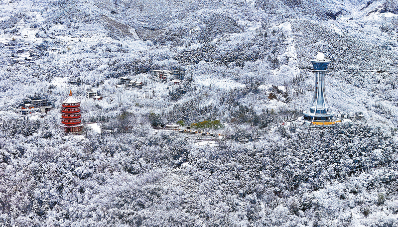 如絮似羽的冬雪将金凤山染成银白,尽显巍峨素雅。