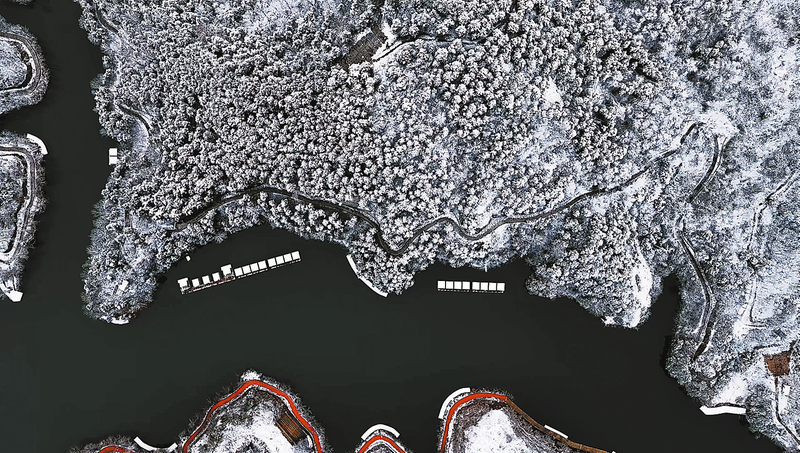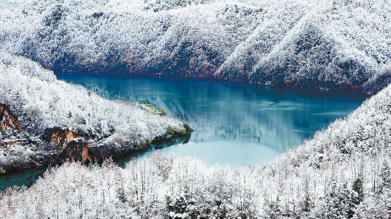 △洛南抚龙湖深色调的水面与白色雪景形成鲜明对比,勾勒出冬日独有的画卷。