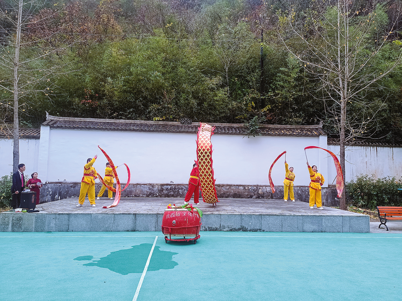 傍晚时分,太子坪村村民在文化大舞台上排练节目。红黄戏服伴着锣鼓声声,尽显乡土活力。11月10日,虽进入初冬,商南县金丝峡镇太子坪村依然涌动着蓬勃生机。农家乐厨房里,“金丝十三花”的香味直往鼻子里钻;民宿小院里,游客的说笑声一阵接一阵;冷水鱼基地边上,钓鱼的人悠闲地盯着水面。