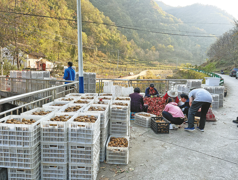△今年,江西沟村猕猴桃喜获丰收。图为10月14日,村民正忙着分拣、装箱,小小的“绿果果”已成为村民增收的“金果子”。