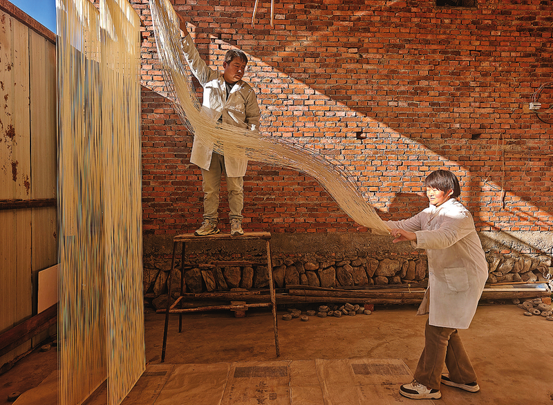郭军盈熟练地登上1米高的梯凳,张益把缠绕在两根木筷上的细面条递上来,他接过稳稳地插在院中近3米高的晾面架上,交替用木筷熟练地分面。张益则猫腰拉起另一端的木筷,有节奏地扯面。两人通过眼神和动作交流,面条在他们手中犹如丝带般舞动。