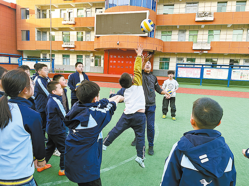 11月27日,在商州区第一小学体育课堂上,老师教学生排球技能。
