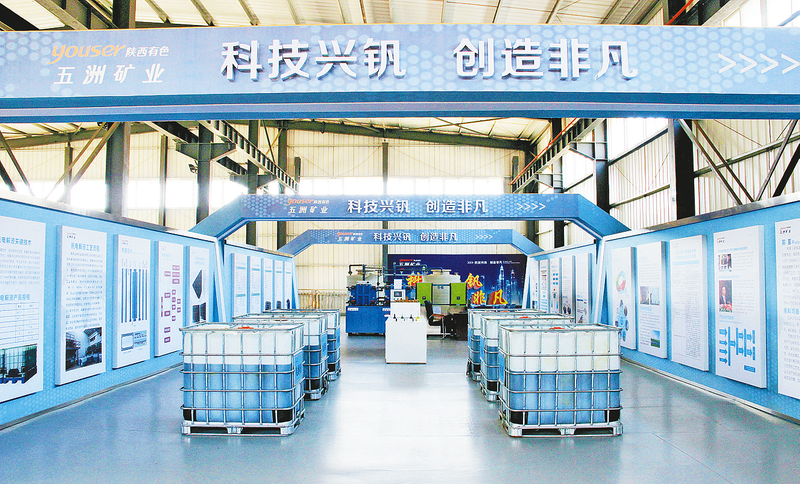 今年以来,陕西五洲矿业股份有限公司灵活调整产品结构,显著提升了高纯五氧化二钒产量。1至10月,该公司成功开拓新能源、特种合金等领域的一批重要客户,新增订单额近亿元。在钒市场震荡下行的背景下,国内市场占有率稳中有进,并在全球钒市场版图中占据了1.7%的份额。图为全钒液流电池电解液展厅。 (本报通讯员 曹 斌 摄)