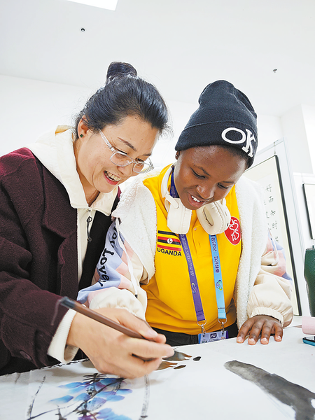 12月9日,参赛队员分批走进商洛中学、商州区高级中学等6所学校,开展文化体验日活动。图为商洛中学老师教乌干达运动员画国画。 (本报记者 景 康 摄)