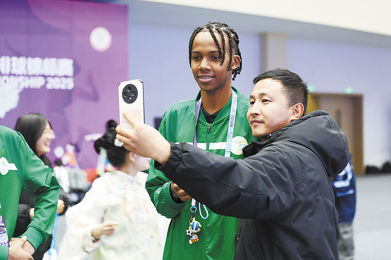 ▷12月9日晚,“2025年U15世界中学生排球锦标赛国家之夜”活动在商洛市职业技术学院大学生活动中心举行,运动员与球迷合影。 (本报记者 石 磊 摄)