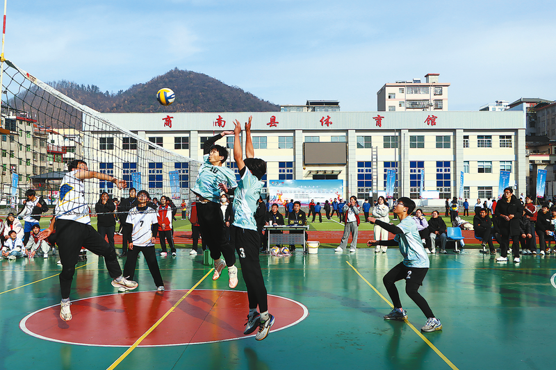 12月16日,“前海开源杯”2025年商南县青少年排球赛在县体育场举行,吸引全县17支代表队同台竞技,帮助青少年在运动中强健体魄、磨砺意志。图为当日男子组比赛现场。 (本报通讯员 李 潇 摄)