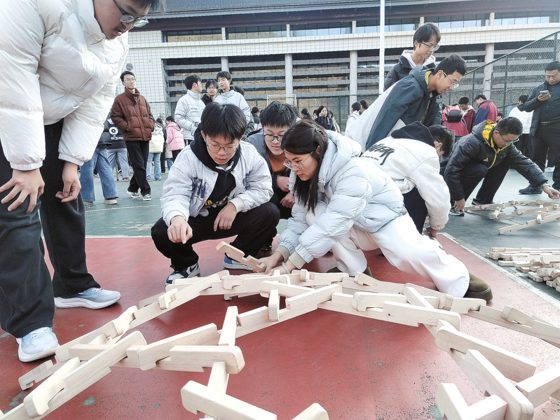 十二月十五日,镇安中学举行校园科技节。图为同学们合力搭建木质结构模型,体会传统榫卯结构的建筑智慧,进一步激发学生的创新思维以及团队合作能力。(本报通讯员杨建东 摄)
