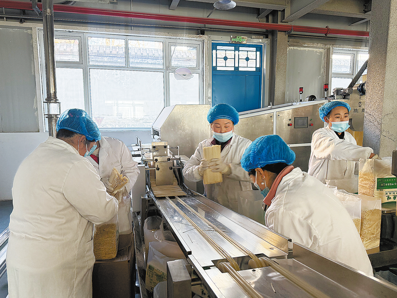 12月25日,商州区郎缘香食品科技有限责任公司生产车间内,工人们正在分装挂面。该公司依托商洛丰富的食用菌产业资源,成功研发了食用菌挂面系列产品,涵盖宽面、韭叶面、龙须面等多种形态,包装规格从0.4至5公斤不等,满足不同消费者需求。目前,该公司日均产量稳定在4至5吨,满产可达20吨,为周边群众提供就业岗位40多个。 (本报记者 王孝竹 摄)