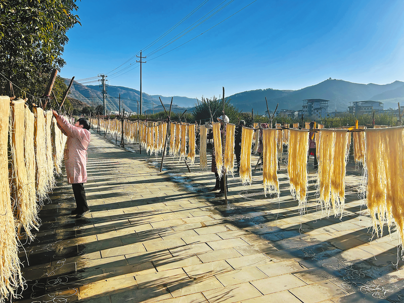 寒冬时节,丹凤县竹林关镇的院落里、广场上,一根根透亮的粉条如银色瀑布般从竹架倾泻而下,村民们穿梭其间,运粉、摊晾、整理,脸上洋溢着收获的喜悦。如今,粉条产业已成为村民在家门口就业增收的重要支柱。(本报通讯员 雷明欣 摄)