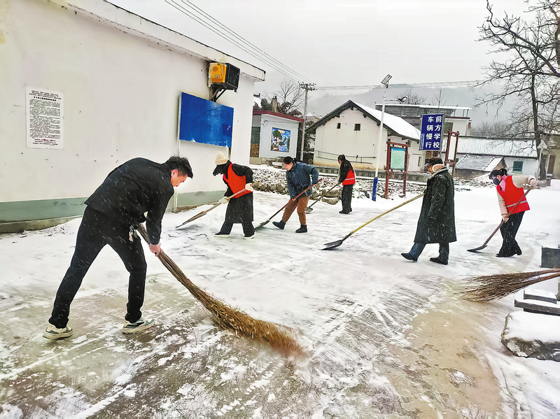 面对降温降雪给群众生产生活带来的不便和困难,我市各地及时组织人员开展铲冰除雪保畅工作。图为1月19日,洛南县保安镇组织集镇单位、驻村工作队和志愿者清理道路冰雪,确保群众出行平安。 (本报通讯员 杨开让 摄)