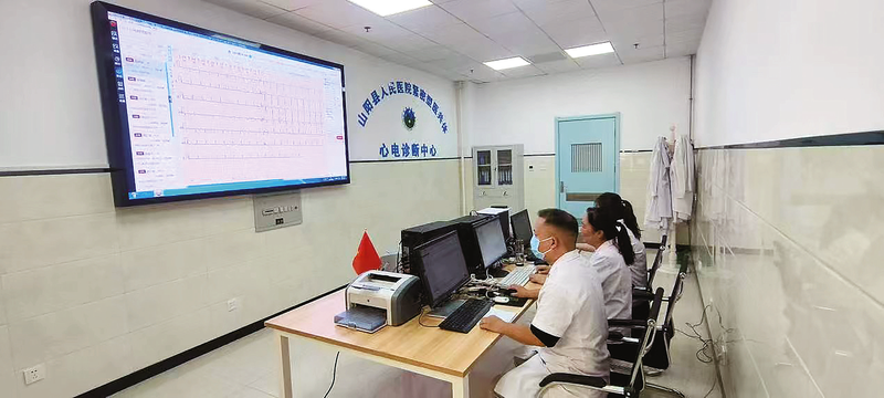 山阳县医共体总院心电诊断中心正在对基层上传的心电检查信息进行 分析诊断。