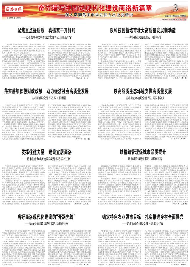王小宁表示,2026年是“十五五”规划开局之年,也是商洛高铁时代启幕之年。市发展改革委将重点在7个方面持续发力。一是依据市委五届九次全会通过的《建议》,抓紧完善全市“十五五”规划《纲要(草案)》,谋划储备“十五五”重大项目不少于700个,总投资不少于3600亿元,其中“十五五”期间投资不少于2000亿元。二是深化高质量项目推进年活动,推行领导包联服务、提级专项督查等六项机制,力争省市级重点项目一、二、三季度开工率分别达到45%、60%、80%以上,力促丹宁高速镇安至宁陕段等97个重大项目开工建设,确保商洛电厂二期等70个项目建成投产(用),全年177个省市级重点项目完成年度投资208亿元以上。三是成立全市特色现代产业体系工作专班,明确目标任务,建立责任清单,着力打造新材料产业集群,培育壮大抽水蓄能和新型储能产业集群,有序发展低空经济,因地制宜发展沟峪经济。四是实施促进民营经济发展“七大行动”,高标准搭建“企业诉求响应、政企沟通对接、技术交流合作和典型宣传推广”4个平台,营造公平竞争的市场环境,力争全年民营经济增加值占GDP比重达60%以上、民间投资增长率达7.5%以上。五是坚持条例护山、规划管山、智慧控山、系统治山,建好用好生态环境(秦岭)保护监测监管平台,持续加强秦岭“五乱”、秦岭违规穿越、黄河流域违法行为等问题专项整治,定期开展“回头看”,确保各类反馈问题动态清零,推动高质量发展与高水平保护相得益彰。六是推进生态产品认证推广,拓展VEP核算结果在绿色金融、政策支持、项目申报等领域应用,推动林业碳汇、用水权等资源权益交易,出台《商洛市生态产品价值实现促进条例》,配合做好国家生态产品价值实现机制试点“两年一考核”工作。七是密切监测当前生产总值、固定资产投资、规上营利性服务业以及工业用电量、银行贷款余额、客货运周转量等经济指标运行情况,实行月调度机制,推动经济稳中求进、稳中向好,奋力实现一季度开门稳。 (本报记者 张 矛)