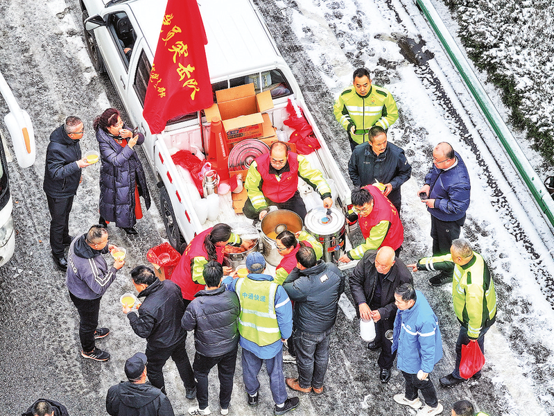 1月20日,一群身穿红马甲的志愿者穿梭在高速公路滞留车流中,将热气腾腾的米粥、早餐递到司乘人员手中。当天,G40沪陕高速商界段遭遇强降雪,气温突降至-4℃,部分路段临时交通管制导致车辆滞留,陕西交控商界分公司第一时间组织3支党员志愿者队伍,清晨奔赴滞留路段,为司乘送上热米粥、鸡蛋、馒头等爱心早餐,同时提供热水补给、路况咨询等,耐心安抚滞留人员情绪,确保大家安全行驶。 (本报记者 杨 鑫 摄)