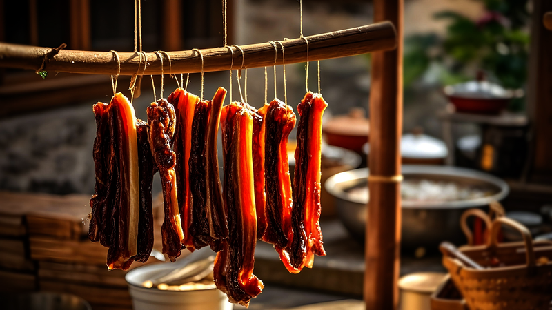 记不清当年是几岁,只记得大人说“又是冬至了”,家家户户就忙开了。我家也不例外,杀猪那天,院子里满是热闹。刨汤宴客走人散,妈妈搬个小板凳,坐在屋檐下腌肉,盐、花椒面、八角面,再倒点酱油和苞谷酒,拌得匀匀的。妈妈的手糙糙的,带点柴火味儿,抓起一块块五花肉、后腿肉,撒上配好的调料,反复涂抹,双手揉捏,指节捏得发白,手背青筋暴起,手上油星子亮晶晶的。腌够一天一夜,妈妈就用棕叶子拧成棕茆子,一块一块串起来,挂在灶台上方。柏树鲜枝压在疙瘩火上,混着橘皮捂出缕缕青烟,慢悠悠熏着,一天两天、十天半个月,肉的颜色慢慢变深,从粉红变成枣红,最后变得棕褐璀璨,香气四溢。