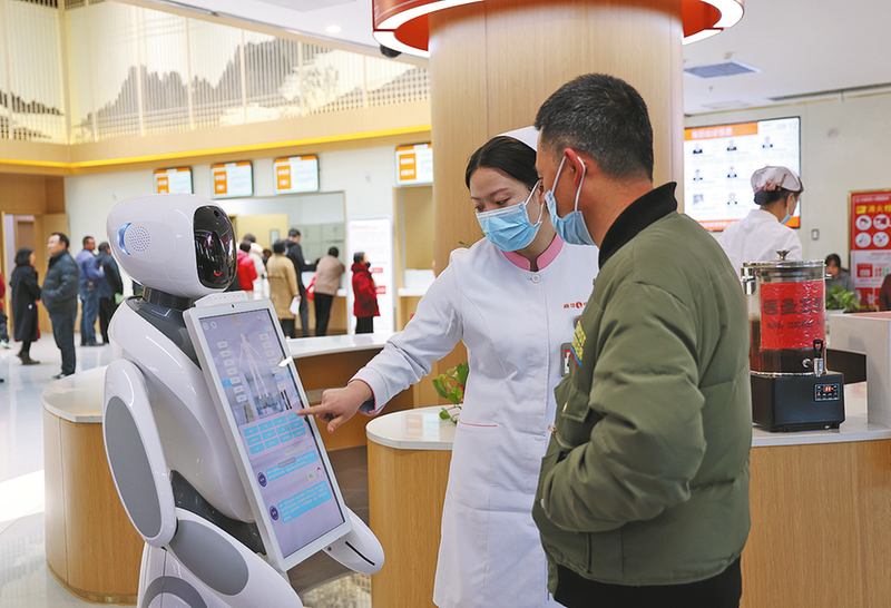 ◁2025年2月26日,商洛市中医医院新门诊楼大厅引进智能机器人“加加”。