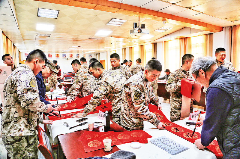 2月7日,商州区文联“强基工程”2026年清廉文化及义写春联“六进”活动走进商洛武警机动中队,10多名书画艺术家现场挥毫泼墨创作绘画、书法作品以及春联,丰富军营文化生活的同时为官兵们送上春节的祝福。     (本报记者 杨 鑫 摄)
