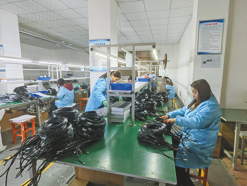 近年来,洛南县加大就业工作帮扶力度,用足用活各类政策举措,积极培育社区工厂和就业帮扶基地,吸纳帮助易地搬迁群众、脱贫劳动力等重点群体就业,促进他们稳定增收。图为2月3日,工人在洛南县永丰镇城东移民搬迁社区工厂加工线缆组件。 (本报通讯员 刘卫锋 摄)