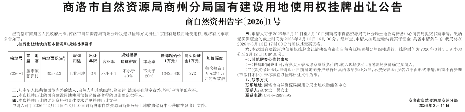 商洛市自然资源局商州分局国有建设用地使用权挂牌出让公告
