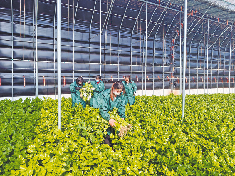 2025年以来,洛南县持续壮大“果烟菌药畜菜”六大主导产业,瞄准全国高品质蔬菜市场需求,着力打造高品质蔬菜供应体系,在丰富群众“菜篮子”的同时,助力农业升级转型。图为2月9日,在洛南县生态农业放心菜示范园(刘涧社区)内,务工人员正在收芹菜,即将发往西安、渭南、咸阳等地,供应春节市场。 (本报通讯员 毕波波 摄)