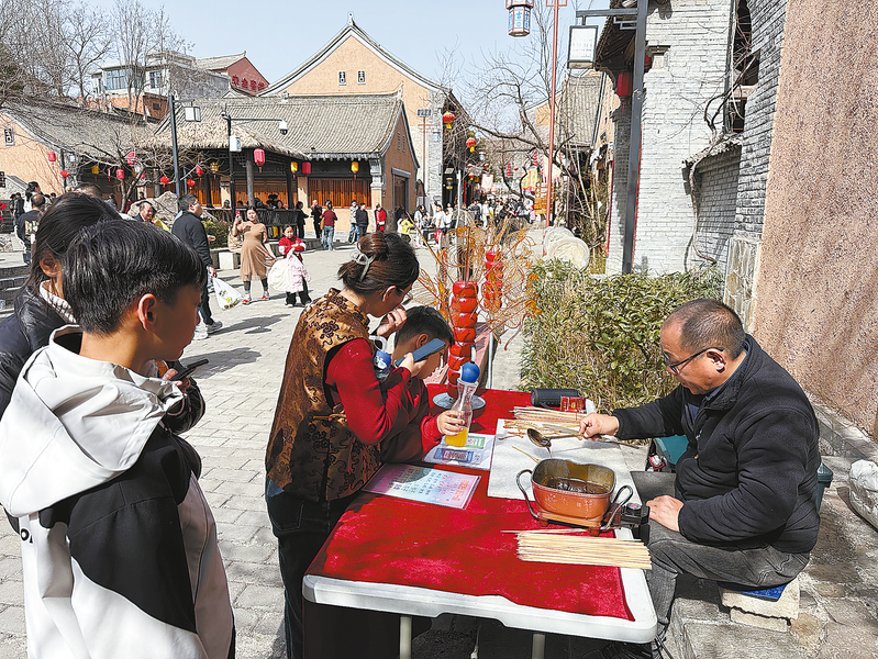 2月21日,丹凤县棣花景区内年味不减,不少游客驻足糖画摊位前挑选购买。匠人以勺为笔、以糖为墨,随手勾勒出栩栩如生的造型,香甜可口的传统糖画深受大家喜爱,非遗技艺在热闹的景区里焕发生机。