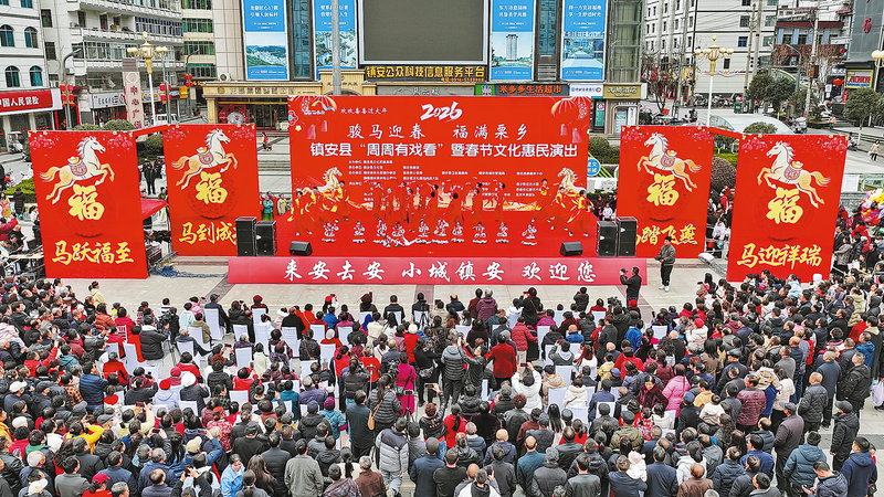 二月二十五日,“骏马迎春·福满栗乡”镇安县二〇二六年“周周有戏看”暨春节文化惠民演出在县城中心广场拉开帷幕。春节期间,镇安县通过举办一系列接地气、有温度的文化惠民演出活动,在营造欢乐、祥和、文明的节日氛围的同时,也让群众在家门口尽享“文化盛宴”。(本报记者马泽平 摄)