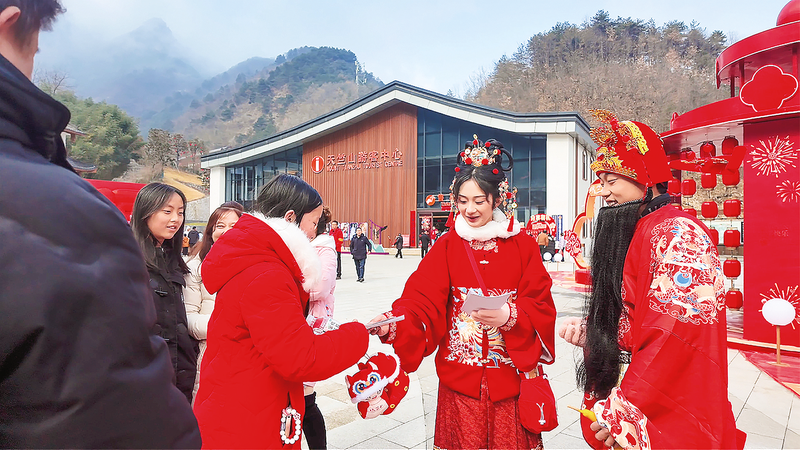 2月21日,在秦岭天竺山景区内,“福禄寿喜财”NPC与游客亲切互动,派发新春祝福。 新春盛景万象更新,年味绵长且意境丰富。春节期间,除了走亲访友、阖家团聚的传统习俗之外,“旅行过大年”也成为许多家庭欢度新春的新选择。新场景新玩法出圈出彩,老民俗与潮文化交融共生,吸引八方游客奔赴商洛,沉浸式“打卡”文旅融合新场景,在浓厚的节日氛围中尽享新春文旅盛宴。