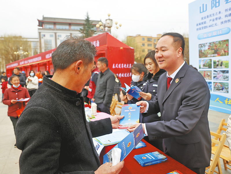 近日,山阳县人民检察院干警通过发放宣传资料、面对面为群众答疑解惑等形式,向外出务工人员普及劳动法、劳动合同法等法律法规,同时针对农民工关心的讨薪取证、劳动争议、劳务合同签订等方面问题进行解答。 (本报通讯员 杨 钊 摄)