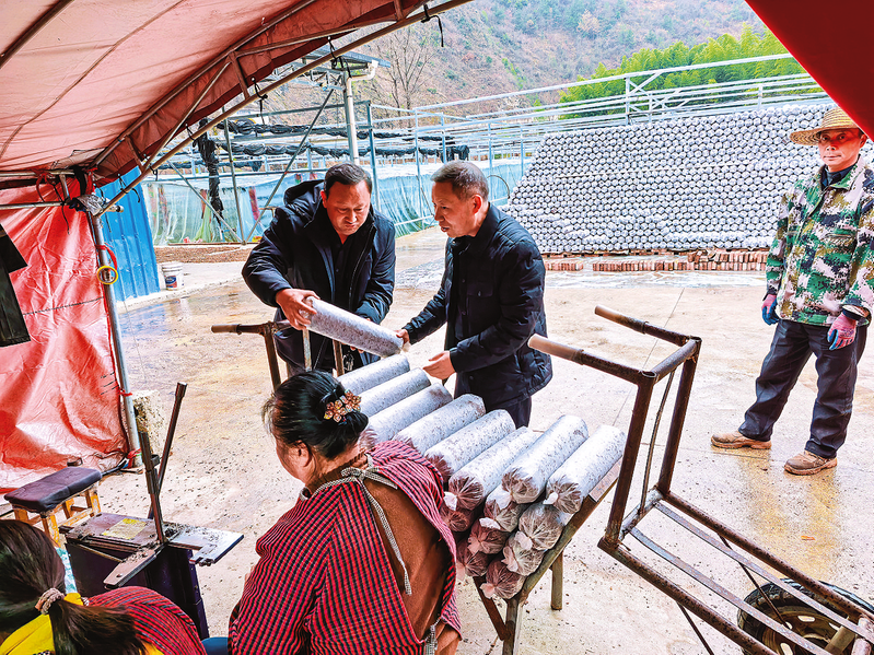 山阳县农业技术人员深入户家塬镇桃园村香菇基地,现场指导香菇菌袋制作。本报讯 (记者 张 英)当前正值春季食用菌生产关键期,山阳县各地抢抓农时,全力推进香菇制袋、木耳进棚、养菌管理等各项工作,田间地头、产业园区处处呈现繁忙景象。
