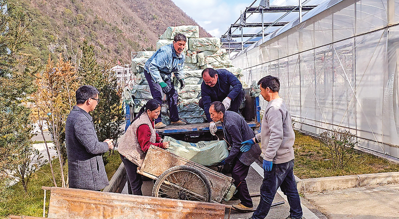 3月4日,柞水县小岭镇金米村一派繁忙景象,干部群众并肩协作,合力将菌包从运输车辆转运至温室大棚,抢抓时节推进食用菌产业发展,以实干担当绘就乡村振兴的生动图景。     (本报记者 朱良娜 摄)