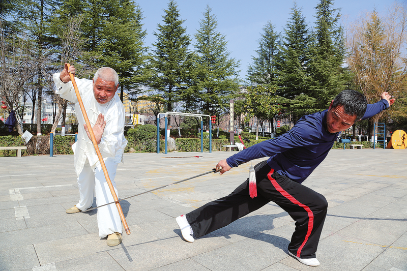 张兴运(左)与郭建民(右)在公园广场中切磋招式。 2025年12月,陕西省人民政府正式公布第八批省级非物质文化遗产代表性项目名录,商洛市商州闯王武术项目成功入选。这一流传于商洛山中300多年的传统军事武术,终于以官方认证的身份,走进更广阔的视野。从明末战场的军事技艺,到如今扎根校园、惠及群众的文化瑰宝,闯王武术在一代代传承人的坚守与创新中,续写着中华武术的商洛篇章,成为商洛文化一张鲜活的名片。
