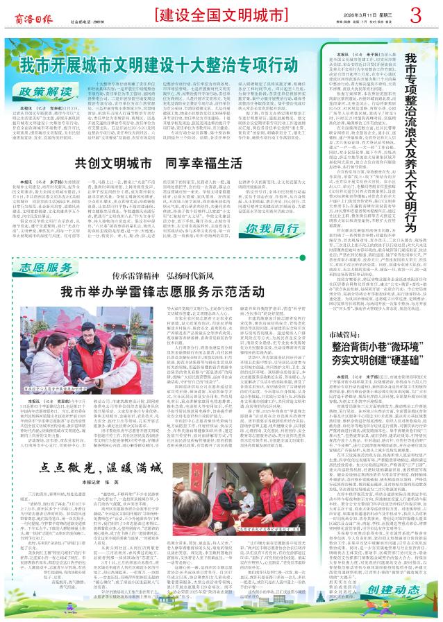 市疾控中心志愿者开展健康知识科普本报讯 (记者 党率航)今年3月5日是第63个学雷锋纪念日,也是第27个中国青年志愿者服务日。当天,团市委在商州区杨峪河镇楚山社区组织开展2026年商洛市“学雷锋志愿服务”示范活动暨共创全国文明城市宣传活动,紧扣雷锋精神时代内涵,持续擦亮城市文明底色,凝聚向上向善的文明力量。